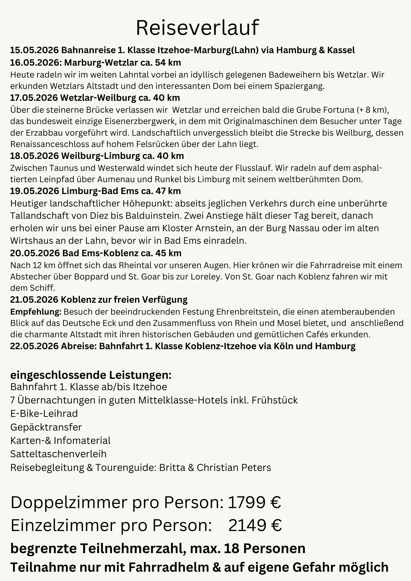 Stellen Sie sich vor, Sie radeln durch eine Landschaft, die wie aus einem Bilderbuch entsprungen scheint: malerische Fachwerkdörfer, weitläufige Naturschutzgebiete und der sanft plätschernde Fluss Lahn, der Sie auf Ihrem Weg begleitet. Unsere E-Bike-Gruppenreise vom 15. bis 22. Mai 2026 bietet genau das – und noch viel mehr! Von Marburg bis Koblenz entdecken wir gemeinsam die Schönheiten des Lahntals, eine der faszinierendsten Radregionen Deutschlands.