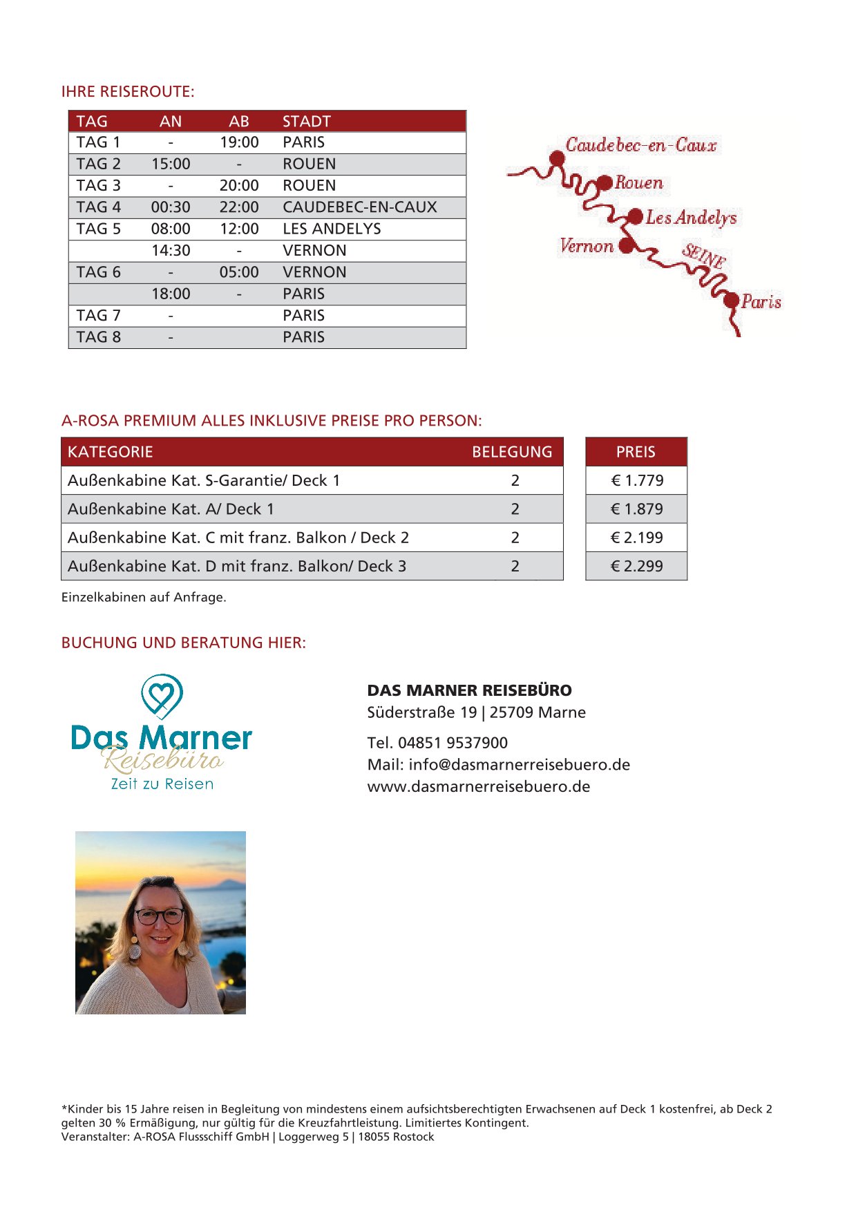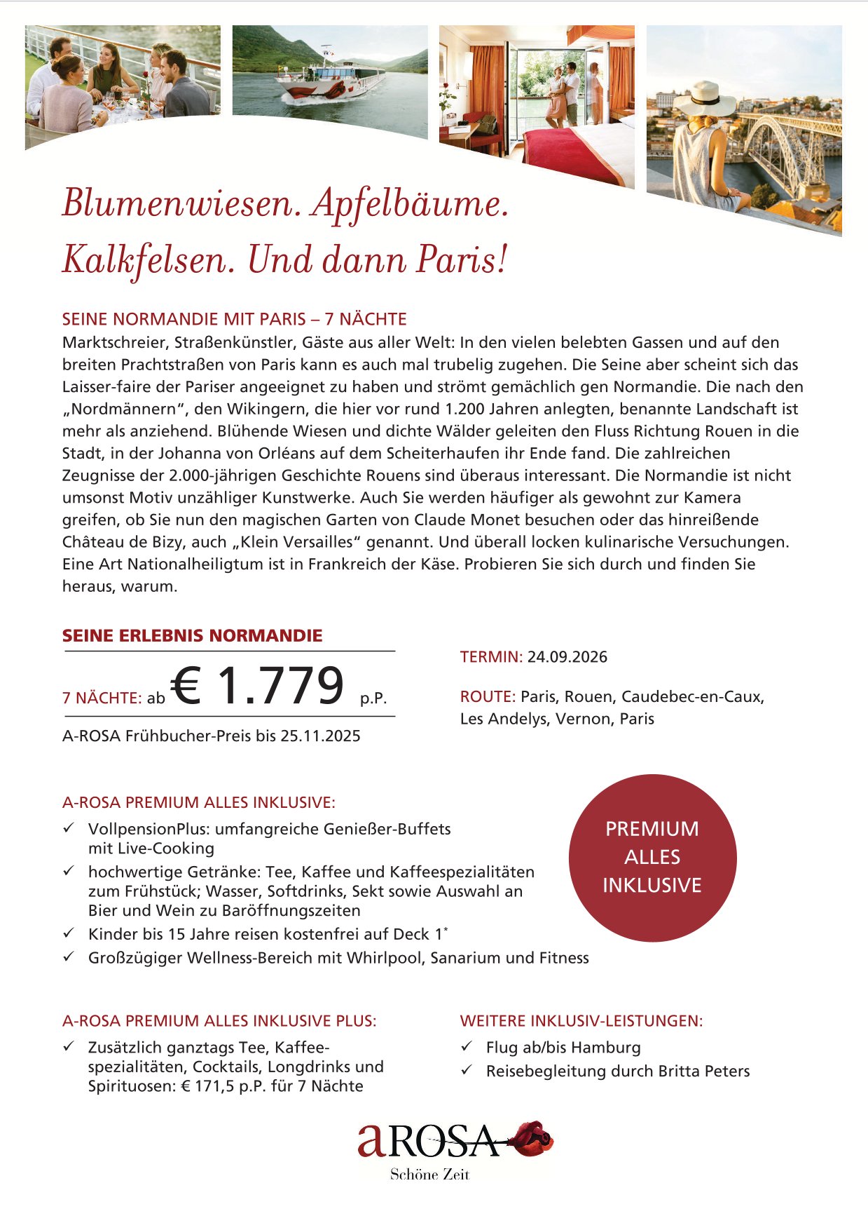 Eine Flusskreuzfahrt mit A-Rosa auf der Seine bietet unvergessliche Erlebnisse. Genieße die malerische Aussicht auf die charmanten Uferstädte wie Paris und Rouen, während Du in luxuriösen Kabinen entspannst. Kulinarische Höhepunkte, darunter exquisite französische Küche und Weinverkostungen, runden das Erlebnis ab und lassen Dich in die Kultur und Geschichte dieser atemberaubenden Region eintauchen.